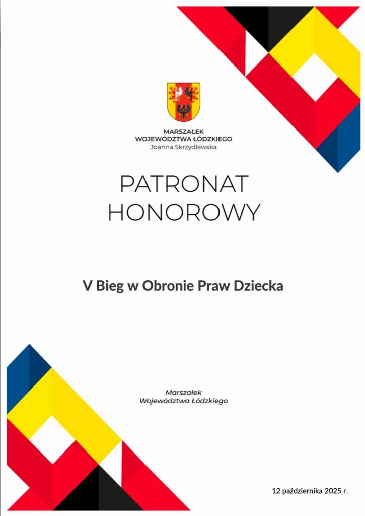 Z ogromną dumą i radością ogłaszamy, że 5. Edycja Biegu w Obronie Praw Dziecka, która odbędzie się 12 października 2025 r. – została objęta Honorowym Patronatem Marszałka Województwa Łódzkiego. ![]()
